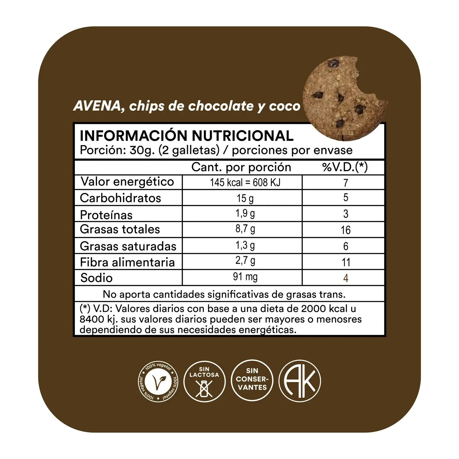 Avena, harina integral de trigo enriquecida (*), aceite vegetal, azúcar morena, azúcar, chip de chocolate semi amargo, coco y polvo de hornear. Contiene avena y derivados de trigo. Puede contener derivados de soja y leche.